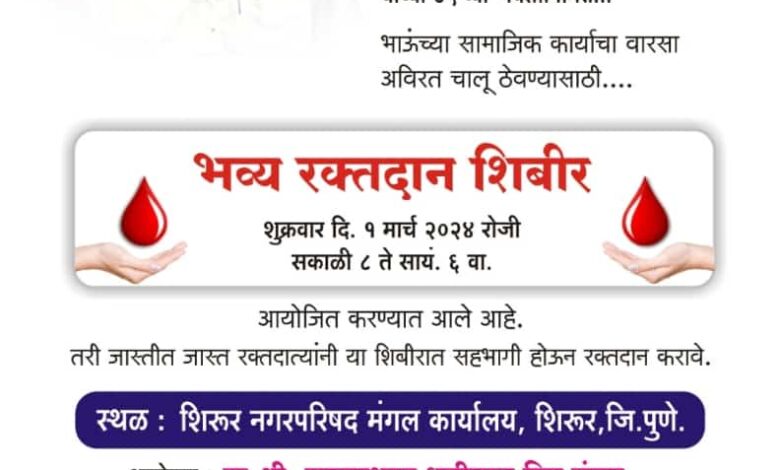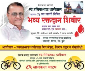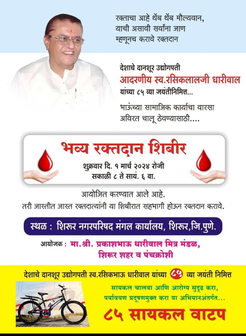 प्रसिध्द उद्योगपती व शिरुर नगरपरिषदेचे माजी नगराध्यक्ष स्व . रसिकलालजी धारीवाल यांच्या ८५ व्या जयंती निमित्त भव्य असे रक्तदान शिबिराचे आयोजन करण्यात आले आहे