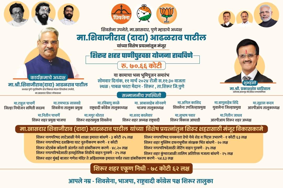 या पाणी पुरवठा योजनेचा शिवसेना उपनेते ,माजी खासदार व म्हाडाचे अध्यक्ष शिवाजीराव आढळराव पाटील यांच्या विशेष प्रयत्नातुन झाली मंजुर झाली असुन या पाणी पुरवठा योजनेचा भुमीपुजन शिवाजीराव आढळराव पाटील यांच्या हस्ते होणार असुन कार्यक्रमाच्या अध्यक्ष स्थानी प्रसिध्द उद्योगपती व सभागृह नेते प्रकाश धारीवाल हे असणार आहे तसेच शहरातील विविध भागातील योजनेसाठी शिवाजीराव आढळराव पाटील यांच्या प्रयत्नातुन शिरुर शहरासाठी पाणी पुरवठा योजना धरुन ७८ कोटी ६२ लक्ष निधी मिळुन दिला आहे .