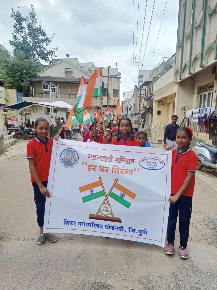 त्यानुषंगाने शिरूर नगरपरिषदेचे प्रशासक तथा मुख्याधिकारी स्मिता काळे यांच्या मार्गदर्शनाखाली शिरूर शहरांमध्ये दि.10 ऑगस्ट रोजी शिरूर नगर परिषदेच्या वतीने विद्यार्थी,शिक्षक, नगरपरिषद अधिकारी, कर्मचारी आणि नागरिक यांच्या सहभागातून “हर घर तिरंगा” अभियान अंतर्गत तिरंगा रॅलीचे यशस्वी आयोजन करण्यात आले. यामध्ये विद्यार्थ्याने सामूहिक देशभक्तीपर सांस्कृतिक नृत्य सादर केले, शहरातून ढोल ताशा वाद्यांसह विद्यार्थ्यांनी तिरंगा ध्वज हातात घेऊन पायी रॅली काढली. शहरातील हुतात्मा शिलाफलकास मानवंदना देऊन “तिरंगा प्रतिज्ञा” घेण्यात आली.