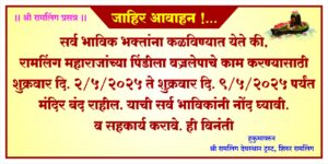 प्रभु श्री रामलिंग मंदीर २ मे ते ९ मे पर्यंत बंद राहणार