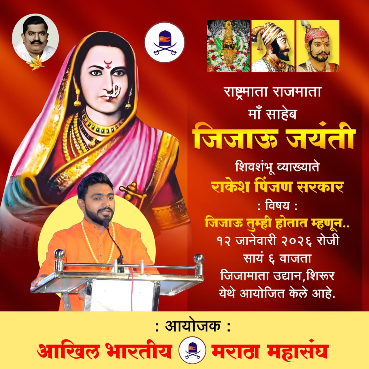 दिनांक 12 जानेवारी रोजी राष्ट्रमाता राजमाता जिजाऊ साहेब यांची जयंती असून या जयंतीच्या निमित्ताने अखिल भारतीय मराठा महासंघाच्या वतीने सायंकाळी साडेपाच वाजता शिवशंभू व्याख्याते राकेश पिंजन सरकार यांचं जिजाऊ तुम्ही होतात म्हणून या विषयावर व्याख्यान आयोजित करण्यात आला असून तसेच विशेष उल्लेखनीय पुरस्कार शिरूर नगरपालिकेच्या नगराध्यक्ष ऐश्वर्या अभिजीत पाचर्णे तसेच आदर्श माता पुरस्कार शांताबाई शिंदे शोभाताई घावटे आदर्श समाजसेविका राणीताई कर्डिले उषाताई वाखारे तर आदर्श शिक्षिका साधनाताई शितोळे यांना यावेळेस सन्मानित करण्यात येणार आहे